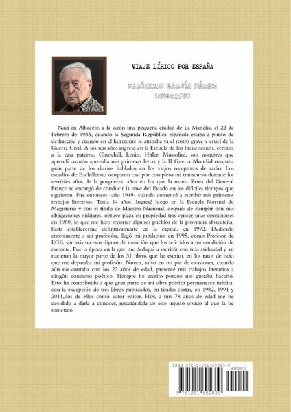 VIAJE LÍRICO POR ESPAÑA es un extenso libro en prosa que escribí durante el trienio 1967-1970. He vuelto a retomar este título para el presente libro, en el que muestro algunos de los 80 capítulos de que consta el anterior, pero he añadido una buena cantidad de poemas que escribí posteriormente y que constan en varios de los 31 libros que he escrito hasta hoy. El tema, como su nombre indica, está referido a los innumerables viajes que he realizado por esta amada España. Estas crónicas viajeras o versos viajeros, como yo los llamo, evocan recuerdos vivos de los lugares visitados. Un monumento, una obra de arte, una vieja ruina, la propia y cambiante naturaleza de la península, un sentimiento anímico, son motivos suficientes para ser reflejados en unos poemas breves.