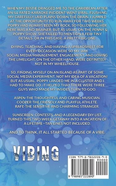 Sometimes, you just need a good vibe. When my bestie dragged me to the Caribbean after an ill-fated karaoke incident went viral, flushing my carefully laid plains down the drain, I jumped at the opportunity to run away for two weeks. Poppy had always been my rock, so following her here was a no-brainer. But as usual on the Penny & Poppy show, she failed to mention a few tiny details. Or in this case, a pretty big one. DIYing, teaching, and having a spreadsheet for every occasion were so my jam. Social media management, engagement, and loving the limelight, on the other hand, were definitely not in my wheelhouse.So, finding myself on an island as part of some social media experiment, not my idea of a vacation! But as usual, Poppy landed me in a cluster and I had to make do. It helped that there were three guys who made my insides turn to goo. Aspen-the thoughtful and caring musician. Cooper-the friendly and playful athlete. Rafe-the sensitive and charming stranger. Sunscreen, contests, and a legendary DIY list, turned this two-week getaway into a vacation of a lifetime-tan lines not included. And to think, it all started because of a vibe. This is a why choose novel, meaning the main female character doesn't have to choose between love interests. This is an adult romance and intended for readers 18+ due to language and content.