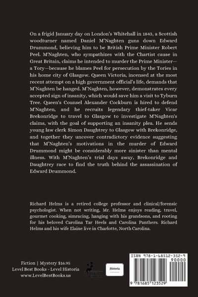 On a frigid January day on London's Whitehall in 1843, a Scottish woodturner named Daniel M'Naghten guns down Edward Drummond, believing him to be British Prime Minister Robert Peel. M'Naghten, who sympathizes with the Chartist cause in Great Britain, claims he intended to murder the Prime Minister-a Tory-because he blames Peel for persecution by the Tories in his home city of Glasgow. Queen Victoria, incensed at the most recent attempt on a high government official's life, demands that M'Naghten be hanged. M'Naghten, however, demonstrates every accepted sign of insanity, which would save him a visit to Tyburn Tree. Queen's Counsel Alexander Cockburn is hired to defend M'Naghten, and he recruits legendary thief-taker Vicar Brekonridge to travel to Glasgow to investigate M'Naghten's claims, with the goal of supporting an insanity plea. He sends young law clerk Simon Daughtrey to Glasgow with Brekonridge, and together they uncover contradictory evidence suggesting that M'Naghten's motivations in the murder of Edward Drummond might be considerably more sinister than mental illness. With M'Naghten's trial days away, Brekonridge and Daughtrey race to find the truth behind the assassination of Edward Drummond.