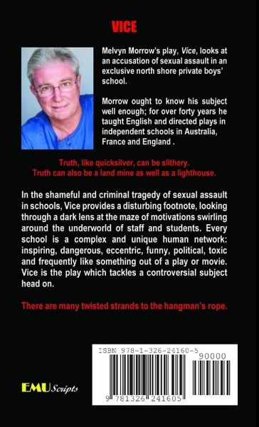 In the shameful and criminal tragedy of sexual assault in schools, Vice provides a disturbing footnote, looking through a dark lens at the maze of motivations swirling around the underworld of staff and students. Every school is a complex and unique human network: inspiring, dangerous, eccentric, funny, political, toxic and frequently like something out of a play or movie. Vice is the play which tackles a controversial subject head on. There are many twisted strands to the hangman's rope.