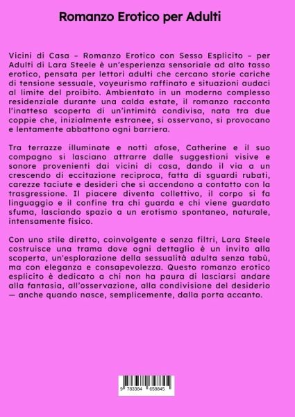Vicini di Casa - Romanzo Erotico con Sesso Esplicito - per Adulti di Lara Steele è un'esperienza sensoriale ad alto tasso erotico, pensata per lettori adulti che cercano storie cariche di tensione sessuale, voyeurismo raffinato e situazioni audaci al limite del proibito. Ambientato in un moderno complesso residenziale durante una calda estate, il romanzo racconta l'inattesa scoperta di un'intimità condivisa, nata tra due coppie che, inizialmente estranee, si osservano, si provocano e lentamente abbattono ogni barriera.Tra terrazze illuminate e notti afose, Catherine e il suo compagno si lasciano attrarre dalle suggestioni visive e sonore provenienti dai vicini di casa, dando il via a un crescendo di eccitazione reciproca, fatta di sguardi rubati, carezze taciute e desideri che si accendono a contatto con la trasgressione. Il piacere diventa collettivo, il corpo si fa linguaggio e il confine tra chi guarda e chi viene guardato sfuma, lasciando spazio a un erotismo spontaneo, naturale, intensamente fisico.Con uno stile diretto, coinvolgente e senza filtri, Lara Steele costruisce una trama dove ogni dettaglio è un invito alla scoperta, un'esplorazione della sessualità adulta senza tabù, ma con eleganza e consapevolezza. Questo romanzo erotico esplicito è dedicato a chi non ha paura di lasciarsi andare alla fantasia, all'osservazione, alla condivisione del desiderio - anche quando nasce, semplicemente, dalla porta accanto.