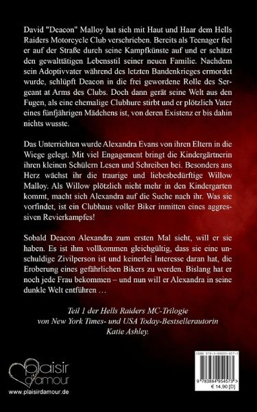 Alex ist Willows Lehrerin und sorgt sich um die Kleine, seit diese ein paar Tage nicht zur Schule gekommen ist. Unter der angegeben Adresse findet sie den Hells Raiders Motorcycle Club vor und wird ziemlich unsanft von Willows Vater in Empfang genommen. Deacon weiß selbst erst seit Kurzem, das er Vater ist und diese Tatsache überfordert ihn. Auf wundersame Weise hat Alex Zugang zu Willow gefunden und bietet ihre Hilfe an. Sie ahnt nicht, welche Gefahr für sie damit einhergeht.
