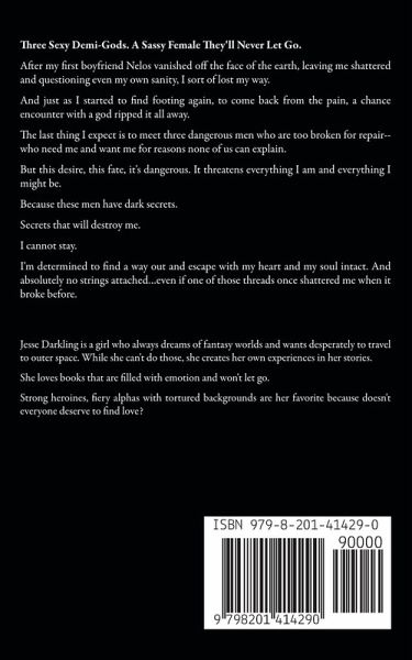 Three Sexy Demi-Gods. A Sassy Female They'll Never Let Go. After my first boyfriend Nelos vanished off the face of the earth, leaving me shattered and questioning even my own sanity, I sort of lost my way. And just as I started to find footing again, to come back from the pain, a chance encounter with a god ripped it all away. The last thing I expect is to meet three dangerous men who are too broken for repair--who need me and want me for reasons none of us can explain. But this desire, this fate, it's dangerous. It threatens everything I am and everything I might be. Because these men have dark secrets. Secrets that will destroy me. I cannot stay. I'm determined to find a way out and escape with my heart and my soul intact. And absolutely no strings attached…even if one of those threads once shattered me when it broke before.