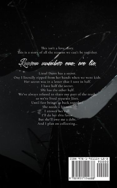 This isn't a love story. This is a story of all the reasons we can't be together. Reason number one: we lie. Liesel Dunn has a secret. One I literally ripped from her hands when we were kids. Her secret was in a letter that I tore in half. I have half the secret. She has the other half. We've always refused to share our part of the truth, so we've lived separate lives. Until fate brings us back together. She needs a hitman. I answer her call. I'll do her this favor. But she'll owe me a debt. And I plan on collecting... This is book 1 in a dark romantic suspense series.