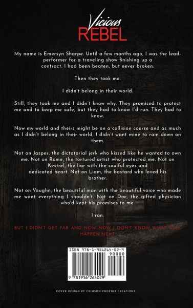My name is Emersyn Sharpe. Until a few months ago, I was the lead performer for a traveling show finishing up a contract. I had been beaten, but never broken. Then they took me. I didn't belong in their world. Still, they took me and I didn't know why. They promised to protect me and to keep me safe, but they had to know I'd run. They had to know. Now my world and theirs might be on a collision course and as much as I didn't belong in their world, I didn't want mine to rain down on them. Not on Jasper, the dictatorial jerk who kissed like he wanted to own me. Not on Rome, the tortured artist who protected me. Not on Kestrel, the liar with the soulful eyes and dedicated heart. Not on Liam, the bastard who loved his brother. Not on Vaughn, the beautiful man with the beautiful voice who made me want everything I shouldn't. Not on Doc, the gifted physician who'd kept his promises to me. I ran. But I didn't get far and now...now I don't know what will happen next. ¿ VICIOUS REBEL is a full length mature college/new adult romance with enemies-to-lovers/love-hate themes. The dark romance aspects of this tale darken with this book. Please be aware some situations may be uncomfortable for readers. This is a reverse harem novel, meaning the main character has more than one love interest. This is book two in the series.