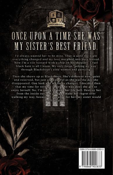 Once upon a time she was my sister's best friend. I'd always wanted her to be mine. That is until the night everything changed and my love morphed into pure hatred. Now I'm a vile bastard with a chip on his shoulder. Cruel black hate is all I know. My only focus *ucking my way through Blackthorn's elite women and partying. Then she shows up at Blackthorn. She's different now, quiet and reserved, but just as beautiful as she was the day she disappeared. One look and my focus changes. I decided then that my time for revenge is now. No way does she get to enjoy herself. No, I'm going to make her life hell. Destroy her from the inside out. I'm going to make her regret ever walking my way, because if it wasn't for her...my sister would still be alive. **This is a standalone DARK bully romance. This book contains scenes that may be triggering to some readers. This is not a YA romance novel and should be read by those only 18+ or older. **