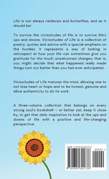 Vicissitudes of Life Life isn't always a smooth sail; sometimes, it's a tempest of highs and lows, and that's exactly how it should be! Vicissitudes of Life is an illuminating three-volume collection designed to explore and celebrate the intricate dance between life's challenges and triumphs. This series is more than just a collection of poetry, quotes, and advice-it's a journey into the heart of what makes life profoundly transformative. Through its pages, you will uncover the beauty hidden within the struggles and discover how adversity can serve as a powerful catalyst for personal growth. Each volume delves into the depths of human experience, offering a rich tapestry of insights that highlight how even the most unwelcome changes can lead to unexpected and often remarkable outcomes. By reflecting on these shifts, you'll come to see them not as mere obstacles, but as essential components of a journey that shapes and refines the soul. Vicissitudes of Life is crafted to be more than just a book; it's a trusted companion for the resilient spirit. It invites you to embrace authenticity, resilience, and a genuine appreciation for life's unpredictable nature. With each turn of the page, you'll find encouragement to remain steadfast and hopeful, even when faced with life's most daunting challenges. Keep this collection close by for daily inspiration and let its profound wisdom guide you through the ever-changing landscape of existence. Whether on your bookshelf or within arm's reach, let Vicissitudes of Life be your beacon of hope and motivation. It's a testament to the strength of the human spirit and a reminder that every storm can give way to a brighter, more enlightened horizon. Embrace the journey, Savor the growth, and let Vicissitudes of Life illuminate the path as you navigate the rich, often unpredictable terrain of your own unique experience.