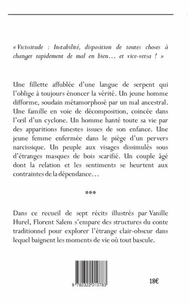 Vicissitude : Instabilité, disposition de toutes choses à changer rapidement de mal en bien... et vice-versa !Une fillette affublée d'une langue de serpent qui l'oblige à toujours énoncer la vérité. Un jeune homme difforme, soudain métamorphosé en éphèbe par un mal ancestral. Une famille en voie de décomposition, coincée dans l'oeil d'un cyclone. Un homme hanté par des apparitions funestes issues de son enfance. Une jeune femme enfermée dans le piège d'un pervers narcissique. Un peuple aux visages dissimulés sous d'étranges masques de bois scarifié. Un couple âgé dont la relation et les sentiments se heurtent aux contraintes de la dépendance...Dans ce recueil de sept récits illustrés par Vanille Hurel, Florent Salem s'empare des structures du conte traditionnel pour explorer sous un angle moderne l'étrange clair-obscur dans lequel baignent les moments de vie où tout bascule.