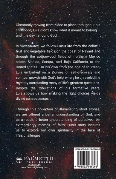 Experience one little boy's remarkable journey of survival, self-discovery, and spiritual growth, from his tumultuous childhood in Mexico to a successful life in the United States. Growing up, Luis's family moved from place to place, never staying long enough to establish friends or be a part of a community. From the colorful fruit and vegetable fields on the coast of Nayarit to the cottonwood fields of the northern Mexican states of Sinaloa, Sonora and Baja, little Luis never knew where he belonged. Lacking self-identity, he struck out on his own at the age of fourteen. He faced difficult decisions to support himself, but along the way, he found God, and his eyes were opened to the possibility of greatness. In Vicissitudes, author Joe Boulder recounts Luis's rise from humble beginnings to success with God's help through a collection of short stories. Having experienced a journey of spiritual growth, he now holds the answers to some of life's greatest questions and offers readers a better understanding of God. Boulder's inspiring memoir will speak to both believers and the spiritually curious.