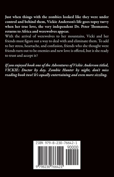 Just when things with the zombies looked like they were under control and behind them, Vickie Anderson's life goes topsy turvy when her true love, the very independent Dr. Peter Thomason, returns to Africa and werewolves appear. With the arrival of werewolves to her mountains, Vicki and her friends must figure out a way to deal with and eliminate them. To add to her stress, heartache, and confusion, friends who she thought were friends turn out to be enemies and new love is offered, but is she ready to trust and accept it? If you enjoyed book one of the Adventures of Vickie Anderson titled, VICKIE: Doctor by day. Zombie Hunter by night, don't miss reading book two! It's equally entertaining and even more sizzling.