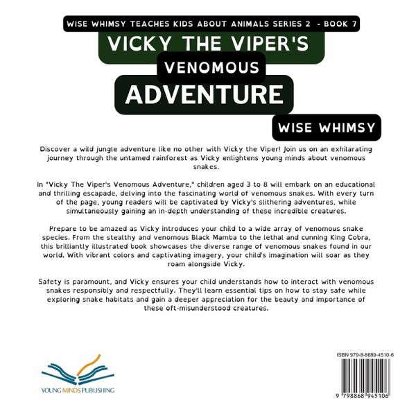 Discover a wild jungle adventure like no other with Vicky the Viper! Join us on an exhilarating journey through the untamed rainforest as Vicky enlightens young minds about venomous snakes. In "Vicky The Viper's Venomous Adventure," children aged 3 to 8 will embark on an educational and thrilling escapade, delving into the fascinating world of venomous snakes. With every turn of the page, young readers will be captivated by Vicky's slithering adventures, while simultaneously gaining an in-depth understanding of these incredible creatures. Prepare to be amazed as Vicky introduces your child to a wide array of venomous snake species. From the stealthy and venomous Black Mamba to the lethal and cunning King Cobra, this brilliantly illustrated book showcases the diverse range of venomous snakes found in our world. With vibrant colors and captivating imagery, your child's imagination will soar as they roam alongside Vicky. But it's not just about the snakes themselves; Vicky also imparts valuable knowledge about their hunting techniques and the vital role they play in the delicate balance of ecosystems. Watch your child's curiosity ignite as they learn about venom delivery mechanisms, how these snakes catch their prey, and their role in keeping nature's harmony intact. Safety is paramount, and Vicky ensures your child understands how to interact with venomous snakes responsibly and respectfully. They'll learn essential tips on how to stay safe while exploring snake habitats and gain a deeper appreciation for the beauty and importance of these oft-misunderstood creatures. "Vicky The Viper's Venomous Adventure" is not just an ordinary children's book; it's an immersive learning experience that will leave your child craving more knowledge. Get ready for an unforgettable journey where education meets excitement, all wrapped up in a vibrant package that will captivate young minds from start to finish. Don't miss out on this exhilarating opportunity to expand your child's horizons and foster a love for nature. Order your copy of "Vicky The Viper's Venomous Adventure" today and let the learning begin!