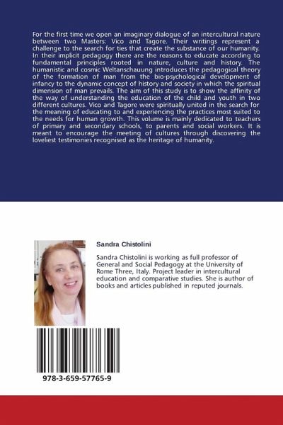 For the first time we open an imaginary dialogue of an intercultural nature between two Masters: Vico and Tagore. Their writings represent a challenge to the search for ties that create the substance of our humanity. In their implicit pedagogy there are the reasons to educate according to fundamental principles rooted in nature, culture and history. The humanistic and cosmic Weltanschauung introduces the pedagogical theory of the formation of man from the bio-psychological development of infancy to the dynamic concept of history and society in which the spiritual dimension of man prevails. The aim of this study is to show the affinity of the way of understanding the education of the child and youth in two different cultures. Vico and Tagore were spiritually united in the search for the meaning of educating to and experiencing the practices most suited to the needs for human growth. This volume is mainly dedicated to teachers of primary and secondary schools, to parents and socialworkers. It is meant to encourage the meeting of cultures through discovering the loveliest testimonies recognised as the heritage of humanity.