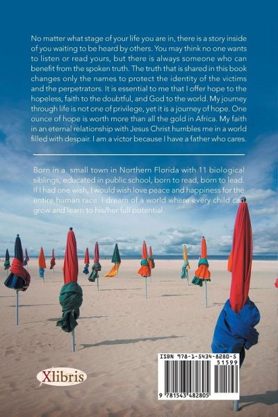 No matter what stage of your life you are in, there is a story inside of you waiting to be heard by others. You may think no one wants to listen or read yours, but there is always someone who can benefit from the spoken truth. The truth that is shared in this book changes only the names to protect the identity of the victims and the perpetrators. It is essential to me that I offer hope to the hopeless, faith to the doubtful, and God to the world. My journey through life is not one of privilege, yet it is a journey of hope. One ounce of hope is worth more than all the gold in Africa. My faith in an eternal relationship with Jesus Christ humbles me in a world filled with despair. I am a victor because I have a father who cares.