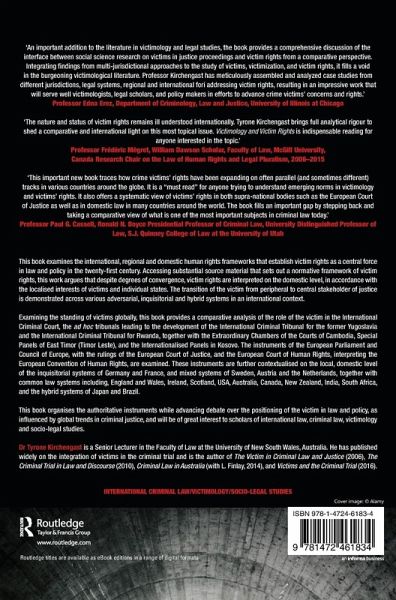 This book provides an international comparative analysis of victim rights' frameworks. The text presents comparative materials on victim rights, laws and policies across a range of countries, legal systems and international bodies such as the ECHR and ICC. The work advances the argument that boundaries which were once cited as distinguishing one system of justice from another are being slowly dismantled by statutory and policy amendment to afford victims a greater role in government decision-making, in legal proceedings, as community stakeholders, and as individuals with enforceable rights.