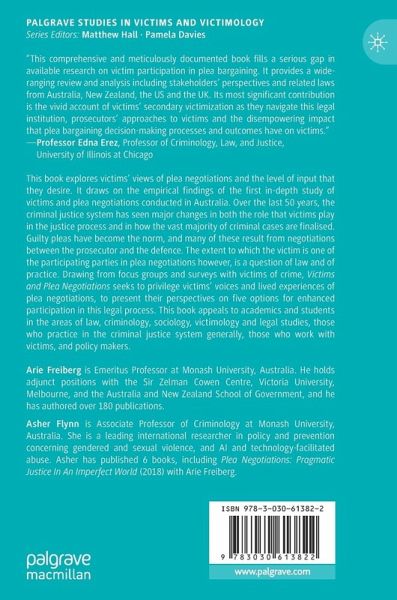 This book explores victims' views of plea negotiations and the level of input that they desire. It draws on the empirical findings of the first in-depth study of victims and plea negotiations conducted in Australia. Over the last 50 years, the criminal justice system has seen major changes in both the role that victims play in the justice process and in how the vast majority of criminal cases are finalised. Guilty pleas have become the norm, and many of these result fromnegotiations between the prosecutor and the defence. The extent to which the victim is one of the participating parties in plea negotiations however, is a question of law and of practice. Drawing from focus groups and surveys with victims of crime, Victims and Plea Negotiations seeks to privilege victims' voices and lived experiences of plea negotiations, to present their perspectives on five options for enhanced participation in this legal process. This book appeals to academicsand students in the areas of law, criminology, sociology, victimology and legal studies, those who practice in the criminal justice system generally, those who work with victims, and policy makers.