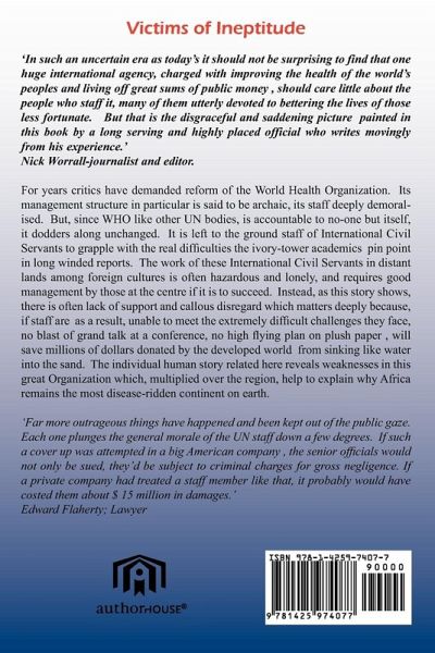 Victims of Ineptitude There are many organizations committed to the fight against ill-health, the best known being the World Health Organization, founded in 1948 and funded from the pockets of ordinary people and their governments. Consider the extraordinary battle the WHO waged against smallpox in the 1970's and won. The latest and probably the toughest challenge so far, is that of AIDS, currently killing millions of people worldwide and leaving behind hords of tiny orphans. The WHO has been one of the leaders in this war which is being waged by its staff of international Civil Servants who take intense personal risks by undertaking heroic action to fight the deadly bacteria and viruses. Those facts and ideas are reflected in this book by a man who travelled for more than two decades in hostile places with scant regard for his own good health and security, in the fight for better health and living conditions among some of the world's poorest and most vulnerable people. It comes as a shock therefore to discover that in the writer's experience, the WHO can be a cold organization which shows little respect for its hardworked staff and considerably wasteful, misspending of its precious public funding to pay for errors and mismanagement. This is a story of human tragedy and massive disillusinment. It will page after page surprise readers of goodwill and reason who will surely find it hard to believe that the administration of such a large outfit with such great responsibility can behave in the way illustrated in the book. This is the saddening picture painted in this book by a long serving and highly placed official who writes movingly from his own experience. The writer and two valued professional colleagues venture to a remote part of Africa on humanitarian WHO mission. The story relates what becomes of them, the callous treatment they and their families receive, the legal lengths the WHO leadership-right to the very top of the Organization -has been