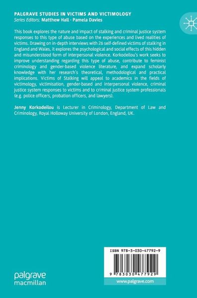 This book explores the nature and impact of stalking and criminal justice system responses to this type of abuse based on the experiences and lived realities of victims. Drawing on in-depth interviews with 26 self-defined victims of stalking in England and Wales, it explores the psychological and social effects of this hidden and misunderstood form of interpersonal violence. Korkodeilou's work seeks to improve understanding regarding this type of abuse, contribute to feminist criminology and gender-based violence literature, and expand scholarly knowledge with her research's theoretical, methodological and practical implications. Victims of Stalking will appeal to academics in the fields of victimology, victimisation, gender-based and interpersonal violence, criminal justice system responses to victims and to criminal justice system professionals (e.g. police officers, probation officers, and lawyers).