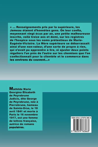 ... Renseignements pris par la supérieure, les Jameau étaient d'honnêtes gens. On leur confia, moyennant vingt écus par an, une petite malheureuse inscrite, voilà treize ans et demi, sur les registres de l'hospice sous les noms prétentieux de Marie-Eugénie-Victoire. La Mère supérieure se débarrassait ainsi d'une non-valeur, d'une sorte de propre à rien, qui n'avait pu apprendre à lire, ni ajuster deux points réguliers l'un près de l'autre sur les chemises que l'on confectionnait pour la clientèle et le commerce dans les environs du couvent...