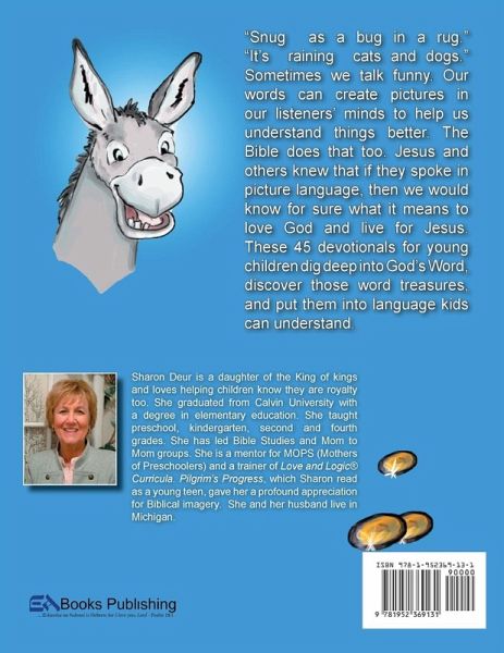 Where do people search for treasure? Deep underwater, in old, dusty mines, in the mountains, even under an old tree on a deserted island. Pirates, bad guys, and even fun-loving little boys bury treasure. To find it you need a special treasure map. The Bible is God's treasure map. Our reward; our "gold" is living in heaven with Him someday. But sometimes we need help "reading" the map and understanding its mystery language. When adults say "light as a feather" or "strong as an ox", we know what they mean. It is very clear that something doesn't weigh very much or that it is very strong. When the Bible speaks in mystery language it may not be so obvious. Why are we called a pot, a sheep, or a branch? Why is Jesus called a Potter, a Shepherd, a Vine, or even a Ladder? These 45 daily digs into God's Word give kids some of the clues and discoveries they need to reach life's reward (their treasure) with God the Father someday. Since a donkey is mentioned more than 100 times in the Bible, it is part of the fun and adventure to have "Victor" help us out. "Discovery" involves searching, exploring, digging, and finding something good! The Bible is full of word treasure-clues; words that put a picture in our minds to make our journey on this earth a discovery of truth. Adults call Bible word treasures metaphors, similes, and imagery. It's called "freedom language" in Romans 6:19 from the Message. Paul says, "I'm using this freedom language because it is easy to picture." After each daily dig there is a list of the Bible verses where the clues can be found. BUT... you have to "Dig Deeper" in the back of the book to find out exactly what those verses say. The versions chosen enable young children to understand. There is also an interactive activity that parents and grandparents can help with. This book will cause children to smile, laugh, think, and ponder. But most of all they will discover the pathway to gold--freedom language for Heaven.