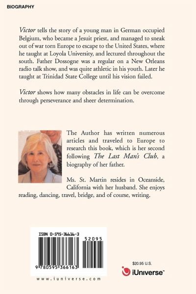 Victor tells the story of a young man in German occupied Belgium, who became a Jesuit priest, and managed to sneak out of war torn Europe to escape to the United States, where he taught at Loyola University, and lectured throughout the south. Father Dossogne was a regular on a New Orleans radio talk show, and was quite athletic in his youth. Later he taught at Trinidad State College until his vision failed. Victor shows how many obstacles in life can be overcome through perseverance and sheer determination.