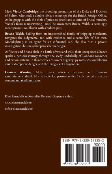 Embark on a captivating journey into the clandestine world of the ton's notorious Cambridge brothers. Meet Victor Cambridge, the brooding second son of the Duke and Duchess of Bolton, who leads a double life as a secret spy for the British Foreign Office. As he grapples with the theft of priceless jewels and escalating insurgences among the lower classes, Victor's focus is unwavering-until he encounters Briana Walsh, a seemingly inconspicuous wallflower with a hidden past. Briana Walsh, hailing from an impoverished family of shipping merchants, navigates the judgmental ton with resilience and a secret life of her own. Moonlighting as an agent for an influential earl, she faces a perilous choice: fulfill her duty or risk the ruin of those she holds dear. As Victor and Briana clash in a battle of wits and wills, their unexpected alliance sparks a perilous journey through the seedy underbelly of London's rookeries and prison systems. Will their tumultuous relationship survive the dangerous secrets that threaten to unravel their worlds? In this enemies-to-lovers Regency spy romance, love blooms amidst deception, danger, and the intrigues of a bygone era. Content Warning: Alpha males, reluctant heroines, and frivolous entertainment ahead. Not suitable for persons under 18. It contains mature content and mild steam.