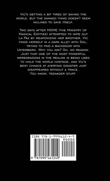 This is the fourth book in the fast-paced, humorous,Victoria Marmot series and continues right after the end of book three. As such this description contains mild spoilers for books one through three. Vic's getting a bit tired of saving the world, but the damned thing doesn't seem inclined to save itself. Two days after MOME (the Ministry of Magical Entities) attempted to wipe out La Paz by weaponizing her brother, Vic finds herself in a dark alley with Sol, trying to find a backdoor into Unterberg. Why you ask? Oh, no reason. Just that one of the most powerful weredragons in the realms is being used to hold the world hostage, and Vic's best chance at averting disaster just disappeared without a trace. You know, normal teenager stuff.