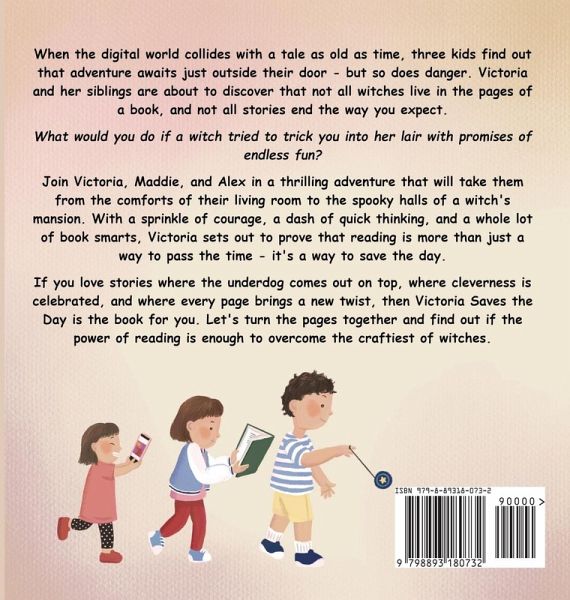 What would you do if a witch tried to trick you into her lair with promises of endless screen time fun? When the digital world collides with a tale as old as time, three kids find out that adventure awaits just outside their door - but so does danger. Victoria and her siblings are about to discover that not all witches live in the pages of a book, and not all stories end the way you expect. Join Victoria, Maddie, and Alex in a thrilling adventure that will take them from the comforts of their living room to the spooky halls of a witch's mansion. With a sprinkle of courage, a dash of quick thinking, and a whole lot of book smarts, Victoria sets out to prove that reading is more than just a way to pass the time - it's a way to save the day. If you love stories where the underdog comes out on top, where cleverness is celebrated, and where every page brings a new twist, then Victoria Saves the Day is the book for you. Let's turn the pages together and find out if the power of reading is enough to overcome the craftiest of witches. Get your copy today!