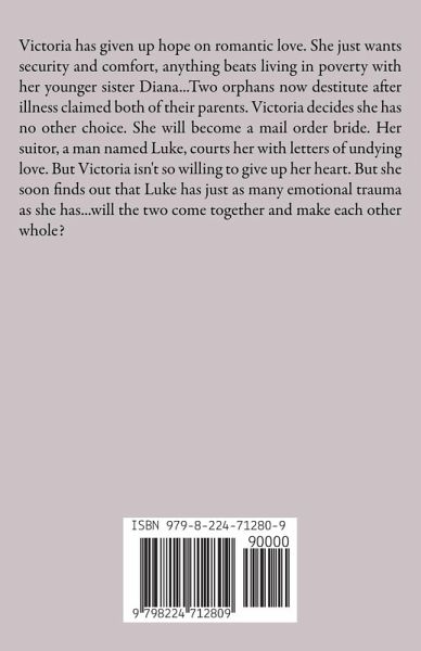 Victoria has given up hope on romantic love. She just wants security and comfort, anything beats living in poverty with her younger sister Diana...Two orphans now destitute after illness claimed both of their parents. Victoria decides she has no other choice. She will become a mail order bride. Her suitor, a man named Luke, courts her with letters of undying love. But Victoria isn't so willing to give up her heart. But she soon finds out that Luke has just as many emotional trauma as she has...will the two come together and make each other whole?