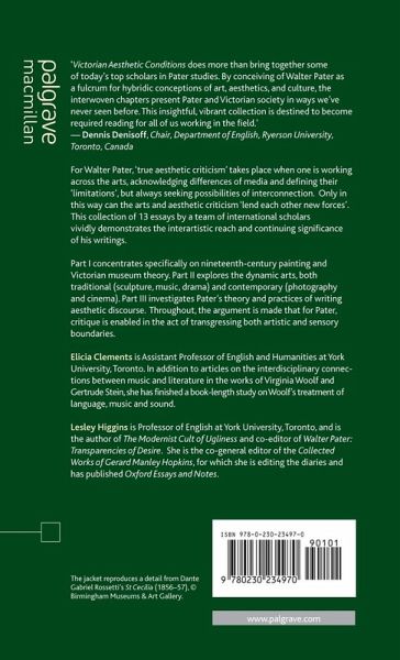' Victorian Aesthetic Conditions does more than bring together some of today's top scholars in Pater studies. By conceiving of Walter Pater as a fulcrum for hybridic conceptions of art, aesthetics, and culture, the interwoven chapters present Pater and Victorian society in ways we've never seen before. This insightful, vibrant collection is destined to become required reading for all of us working in the field.' - Dennis Denisoff, Chair, Department of English Member, Ryerson University, Toronto, Canada