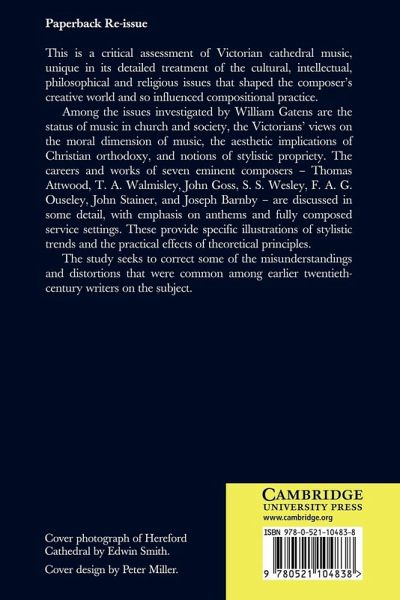 This is a critical assessment of Victorian cathedral music, unique in its detailed treatment of the cultural intellectual, philosophical and religious issues that shaped the composer's creative world and so influenced compositional practice. Among the issues investigated by William Gatens are the status of music in Church and society, the Victorians' views on the moral dimension of music, the aesthetic implications of Christian orthodoxy and notions of stylistic propriety. The careers and works of seven eminent composers - Thomas Attwood, T. A. Walmisley, John Goss, S. S. Wesley, F. A. G. Ouseley, John Stainer and Joseph Barnby - are discussed in some detail with emphasis on anthems and fully composed service settings. These provide specific illustrations of stylistic trends and the practical effects of theoretical principles. The study seeks to correct some of the misunderstandings and distortions that were common among earlier twentieth-century writers on the subject.