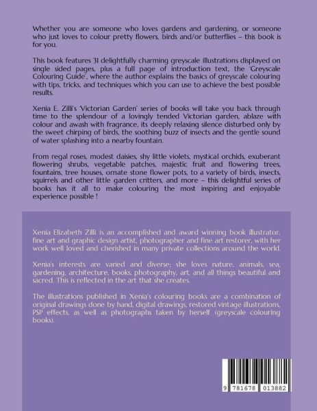 Whether you are someone who loves gardens and gardening, or someone who just loves to colour pretty flowers, birds and/or butterflies - this book is for you. This book features 31 delightfully charming greyscale illustrations displayed on single sided pages, plus a full page of introduction text, the 'Greyscale Colouring Guide', where the author explains the basics of graeyscale colouring with tips, tricks, and techniques which you can use to achieve the best possible results. Xenia E. Zilli's 'Victorian Garden' series of books will take you back through time to the splendour of a lovingly tended Victorian garden, ablaze with colour and awash with fragrance, its deeply relaxing silence disturbed only by the sweet chirping of birds, the soothing buzz of insects and the gentle sound of water splashing into a nearby fountain. From regal roses, modest daisies, shy little violets, mystical orchids, exuberant flowering shrubs, vegetable patches, majestic fruit and flowering trees, fountains, tree houses, ornate stone flower pots, to a variety of birds, insects, squirrels and other little garden critters, and more - this delightful series of books has it all to make colouring the most inspiring and enjoyable experience possible !