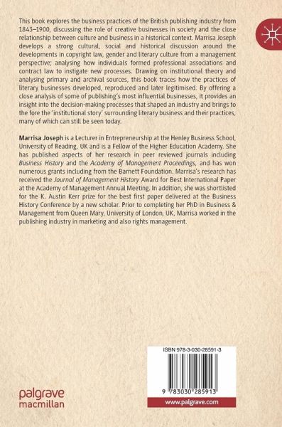 This book explores the business practices of the British publishing industry from 1843-1900, discussing the role of creative businesses in society and the close relationship between culture and business in a historical context. Marrisa Joseph develops a strong cultural, social and historical discussion around the developments in copyright law, gender and literary culture from a management perspective; analysing how individuals formed professional associations and contract law to instigate new processes. Drawing on institutional theory and analysing primary and archival sources, this book traces how the practices of literary businesses developed, reproduced and later legitimised. By offering a close analysis of some of publishing's most influential businesses, it provides an insight into the decision-making processes that shaped an industry and brings to the fore the 'institutional story' surrounding literary business and their practices, many of which can still be seen today.