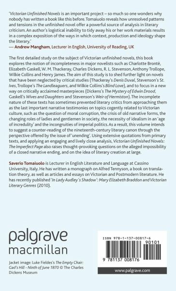 'Victorian Unfinished Novels is an important project so much so one wonders why nobody has written a book like this before. Tomaiuolo reveals how unresolved patterns and tensions in the unfinished novel offer a powerful source of analysis in literary criticism. An author's logistical inability to tidy away his or her work materials results in a complex exposition of the ways in which context, production and ideology shape the literary.' - Andrew Mangham, Lecturer in English, University of Reading, UK