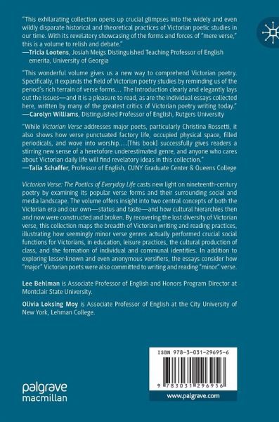 Victorian Verse: The Poetics of Everyday Life casts new light on nineteenth-century poetry by examining the period through its popular verse forms and their surrounding social and media landscape. The volume offers insight into two central concepts of both the Victorian era and our own-status and taste-and how cultural hierarchies then and now were and are constructed and broken. By recovering the lost diversity of Victorian verse, the book maps the breadth of Victorian writing and reading practices, illustrating how these seemingly minor verse genres actually possessed crucial social functions for Victorians, particularly in education, leisure practices, the cultural production of class, and the formation of individual and communal identities. The essays consider how "major" Victorian poets, such as the Pre-Raphaelites, were also committed to writing and reading "minor" verse, further troubling the clear-cut notions of canonicity by examining the contradictions of value.