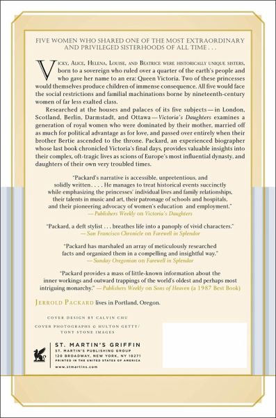 Five women who shared one of the most extraordinary and privileged sisterhoods of all time... Vicky, Alice, Helena, Louise, and Beatrice were historically unique sisters, born to a sovereign who ruled over a quarter of the earth's people and who gave her name to an era: Queen Victoria. Two of these princesses would themselves produce children of immense consequence. All five would face the social restrictions and familial machinations borne by ninetheenth-century women of far less exalted class. Researched at the houses and palaces of its five subjects-- in London, Scotland, Berlin, Darmstadt, and Ottawa-- Victoria's Daughters examines a generation of royal women who were dominated by their mother, married off as much for political advantage as for love, and passed over entirely when their brother Bertie ascended to the throne. Packard, an experienced biographer whose last book chronicled Victoria's final days, provides valuable insights into their complex, oft-tragic lives as scions of Europe's most influential dynasty, and daughters of their own very troubled times.