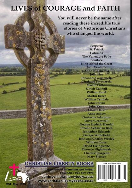 Victorious Christians includes: 32 Character studies with over 260 pictures. The 380-page book includes 10 Reformers, 6 Martyrs, 6 Missionaries, 4 Evangelists, 4 Professors, 3 Soldiers, 2 Musicians, 2 Kings, 1 Artist, an Inventor, an Historian and a Queen. This book provides fascinating insights to virtually every age of Church history by focusing on Christian characters, their courage and convictions in times of crisis. Lavishly illustrated, this book can be used for recreational reading by those who enjoy reading Biographies, or as a treasure trove of illustrations and examples for pastors, teachers and homeschoolers. Each character's biography contains enough information to make them familiar without being too long of a read. The many many pictures collected by Dr Hammond will be of interest to adults and children alike and will further cement the reality of the life and times of the book's subjects.