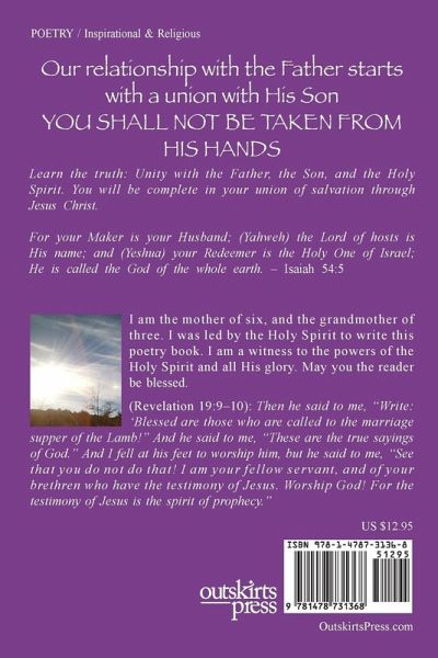 I am the mother of six, and the grandmother of three. I was led by the Holy Spirit to write this poetry book. I am a witness to the powers of the Holy Spirit and all His glory. May you the reader be blessed. (Revelation 19:9-10): Then he said to me, "Write: 'Blessed are those who are called to the marriage supper of the Lamb!" And he said to me, "These are the true sayings of God." And I fell at his feet to worship him, but he said to me, "See that you do not do that! I am your fellow servant, and of your brethren who have the testimony of Jesus. Worship God! For the testimony of Jesus is the spirit of prophecy."