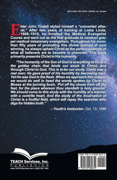 Elder John Tindall styled himself a "converted atheist." After two years of training at Loma Linda, 1908–1910, he finished the Medical Evangelist Course and went out as the first graduate to conduct gospel medical missionary evangelism. Throughout his more-than fifty years of promoting this divine method of soul winning, he always upheld Christ as the perfect example of what all believers are to become in character. This book primarily presents Christ in His humanity. "The humanity of the Son of God is everything to us. It is the golden chain that binds our souls to Christ, and through Christ to God. This is to be our study. Christ was a real man; He gave proof of his humility by becoming man. Yet He was God in the flesh. When we approach this subject we would do well to heed the words spoken by Christ to Moses at the burning bush, `Put off thy shoes from off thy feet, for the place whereon thou standeth is holy ground.’ We should come to this study with the humility of a learner, with a contrite heart. And the study of the incarnation of Christ is a fruitful field, which will repay the searcher who digs for hidden truth." —Youth’s Instructor, Oct. 13, 1898