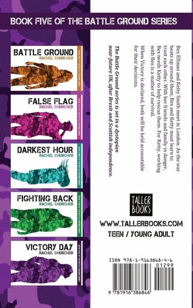 Bex Ellman and Ketty Smith meet in London. As the war heats up around them, Bex and Ketty must learn to trust each other. With her friends and family in danger, Bex needs Ketty to help rescue them. For Ketty, working with Bex is a matter of survival. When Victory is declared, both will be held accountable for their decisions. The Battle Ground series is set in a dystopian near-future UK, after Brexit and Scottish independence.