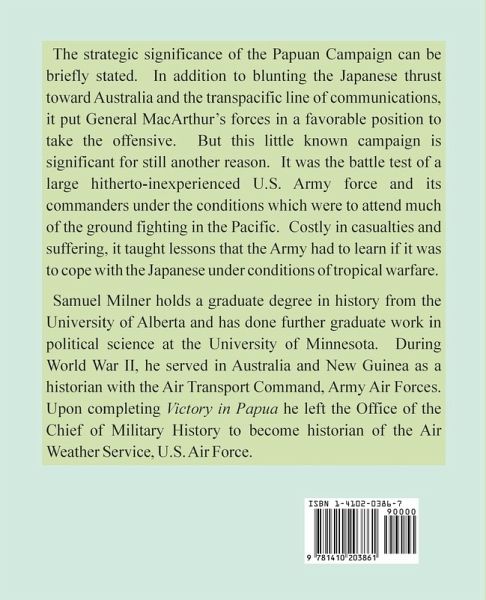 The strategic significance of the Papuan Campaign can be briefly stated. In addition to blunting the Japanese thrust toward Australia and the transpacific line of communications, it put General MacArthur's forces in a favorable position to take the offensive. But this little known campaign is significant for still another reason. It was the battle test of a large hitherto-inexperienced U.S. Army force and its commanders under the conditions which were to attend much of the ground fighting in the Pacific. Costly in casualties and suffering, it taught lessons that the Army had to learn if it was to cope with the Japanese under conditions of tropical warfare. Samuel Milner holds a graduate degree in history from the University of Alberta and has done further graduate work in political science at the University of Minnesota. During World War II, he served in Australia and New Guinea as a historian with the Air Transport Command, Army Air Forces. Upon completing Victory in Papua he left the Office of the Chief of Military History to become historian of the Air Weather Service, U.S. Air Force.