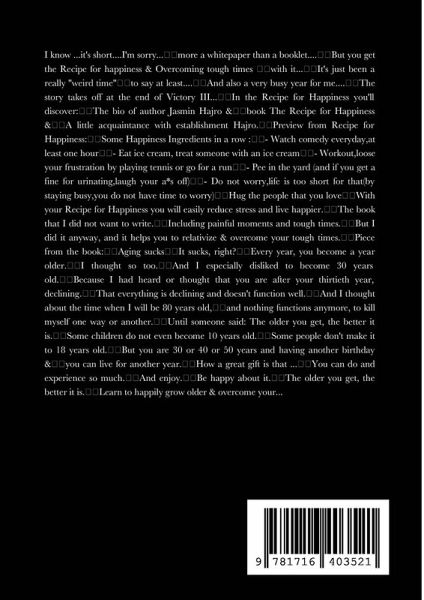 I know ...it's short....I'm sorry... more a whitepaper than a booklet.... But you get the Recipe for happiness & Overcoming tough times with it... It's just been a really ''weird time'' to say at least.... And also a very busy year for me.... The story takes off at the end of Victory III... In the Recipe for Happiness you'll discover: The bio of author Jasmin Hajro & book The Recipe for Happiness & A little acquaintance with establishment Hajro. Preview from Recipe for Happiness: Some Happiness Ingredients in a row : - Watch comedy everyday,at least one hour - Eat ice cream, treat someone with an ice cream - Workout,loose your frustration by playing tennis or go for a run - Pee in the yard (and if you get a fine for urinating,laugh your a*s off) - Do not worry,life is too short for that(by staying busy,you do not have time to worry) Hug the people that you love With your Recipe for Happiness you will easily reduce stress and live happier. The book that I did not want to write. Including painful moments and tough times. But I did it anyway, and it helps you to relativize & overcome your tough times. Piece from the book: Aging sucks It sucks, right? Every year, you become a year older. I thought so too. And I especially disliked to become 30 years old. Because I had heard or thought that you are after your thirtieth year, declining. That everything is declining and doesn't function well. And I thought about the time when I will be 80 years old, and nothing functions anymore, to kill myself one way or another. Until someone said: The older you get, the better it is. Some children do not even become 10 years old. Some people don't make it to 18 years old. But you are 30 or 40 or 50 years and having another birthday & you can live for another year. How a great gift is that ... You can do and experience so much. And enjoy. Be happy about it. The older you get, the better it is. Learn to happily grow older & overcome your difficulties & your tough times My setbacks, tough times and comebacks from real life...