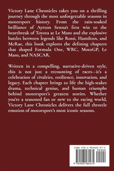 Victory Lane Chronicles takes you on a thrilling journey through the most unforgettable seasons in motorsport history. From the rain-soaked brilliance of Ayrton Senna's first win to the heartbreak of Toyota at Le Mans and the explosive battles between legends like Rossi, Hamilton, and McRae, this book explores the defining chapters that shaped Formula One, WRC, MotoGP, Le Mans, and NASCAR. Written in a compelling, narrative-driven style, this is not just a recounting of races-it's a celebration of rivalries, resilience, innovation, and legacy. Each chapter brings to life the high-stakes drama, technical genius, and human triumphs behind motorsport's greatest stories. Whether you're a seasoned fan or new to the racing world, Victory Lane Chronicles delivers the full throttle emotion of motorsport's most iconic seasons.