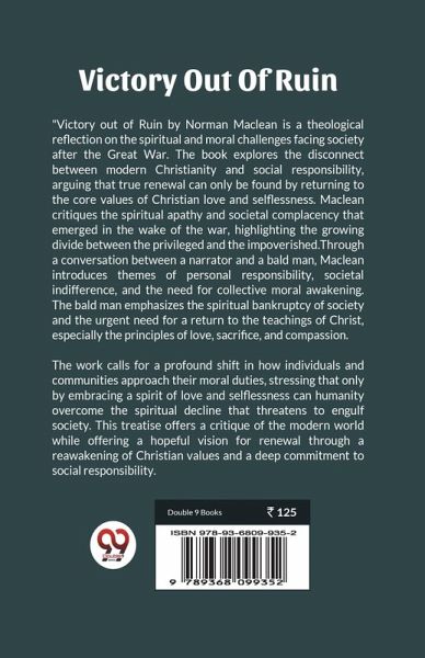 Victory out of Ruin by Norman Maclean is a theological reflection on the spiritual and moral challenges facing society after the Great War. The book explores the disconnect between modern Christianity and social responsibility, arguing that true renewal can only be found by returning to the core values of Christian love and selflessness. Maclean critiques the spiritual apathy and societal complacency that emerged in the wake of the war, highlighting the growing divide between the privileged and the impoverished. Through a conversation between a narrator and a bald man, Maclean introduces themes of personal responsibility, societal indifference, and the need for collective moral awakening. The bald man emphasizes the spiritual bankruptcy of society and the urgent need for a return to the teachings of Christ, especially the principles of love, sacrifice, and compassion. The work calls for a profound shift in how individuals and communities approach their moral duties, stressing that only by embracing a spirit of love and selflessness can humanity overcome the spiritual decline that threatens to engulf society. This treatise offers a critique of the modern world while offering a hopeful vision for renewal through a reawakening of Christian values and a deep commitment to social responsibility.