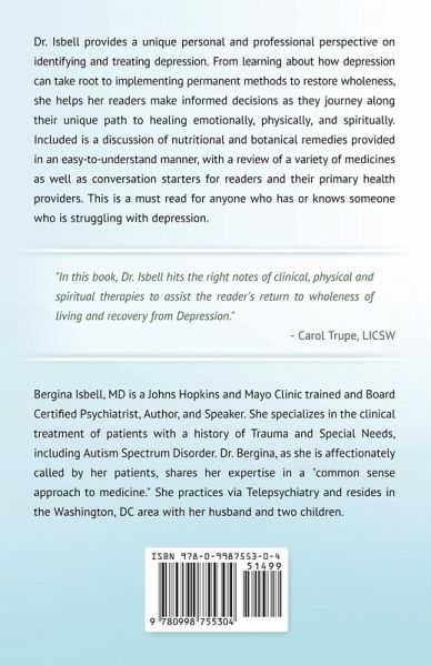 Dr. Isbell provides a unique personal and professional perspective on identifying and treating depression. From learning about how depression can take root to implementing permanent methods to restore wholeness, she helps her readers make informed decisions as they journey along their unique path to healing emotionally, physically, and spiritually. Included is a discussion of nutritional and botanical remedies provided in an easy-to-understand manner, with a review of a variety of medicines as well as conversation starters for readers and their primary health providers. She helps foster hope on the way to helping readers achieve relief and healing from depression. Her review of the medication classes includes information to be aware of including side effects of medicines, both useful and adverse effects. She discusses medicines and spirituality, answering questions that patients of a variety of faith backgrounds have posed. For the Judeo Christian, scriptures for healing are included as well as positive affirmations for those of a different belief system.
