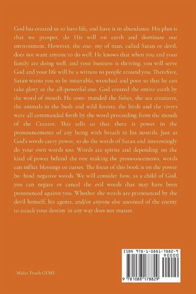 God has created us to have life, and have it in abundance. His plan is that we prosper, do His will on earth and dominate our environment. However, the ene- my of man, called Satan or devil, does not want anyone to do well. He knows that when you and your family are doing well, and your business is thriving, you will serve God and your life will be a witness to people around you. Therefore, Satan wants you to be miserable, wretched and poor so that he can take glory as the all-powerful one. God created the entire earth by the word of mouth. He com- manded the fishes, the sea creatures, the animals in the bush and wild forests, the birds and the rivers were all commanded forth by the word proceeding from the mouth of the Creator. This tells us that there is power in the pronouncements of any being with breath in his nostrils. Just as God's words carry power, so do the words of Satan and interestingly do your own words too. Words are spirits and depending on the kind of power behind the one making the pronouncements, words can inflict blessings or curses. The focus of this book is on the power be- hind negative words. We will consider how, as a child of God, you can negate or cancel the evil words that may have been pronounced against you. Whether the words are pronounced by the devil himself, his agents, and/or anyone else anointed of the enemy to attack your destiny in any way does not matter.