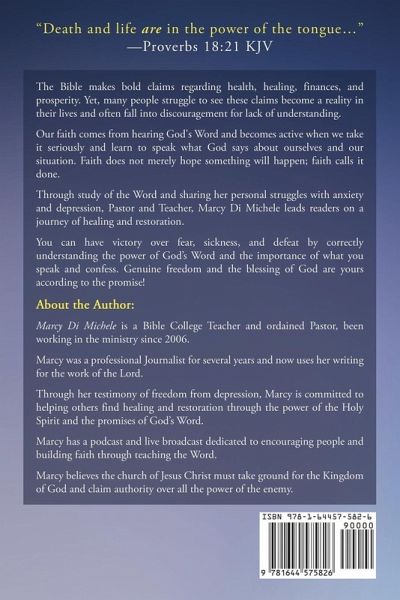 "Death and life are in the power of the tongue..." ~Proverbs 18:21 KJV The Bible makes bold claims regarding health, healing, finances, and prosperity. Yet, many people struggle to see these claims become a reality in their lives and often fall into discouragement. Our faith comes from hearing God's Word and becomes active when we take it seriously and learn to speak what God says over our lives. Faith does not merely hope something will happen; faith calls it done. Through the study of the Word and sharing her personal struggles with anxiety and depression, Pastor and Teacher, Marcy Di Michele leads readers on a journey of healing and restoration. You can win over fear, sickness, and defeat by correctly understanding the power of God's Word and using your words correctly. Genuine freedom and the blessing of God are yours for the taking.