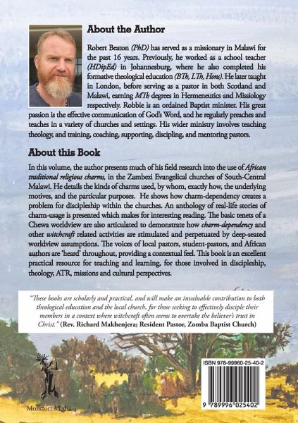 In this volume, the author presents much of his field research into the use of African traditional religious charms, in the Zambezi Evangelical churches of South-Central Malawi. He details the kinds of charms used, by whom, exactly how, the underlying motives, and the particular purposes. He shows how charm-dependency creates a problem for discipleship within the churches. An anthology of real-life stories of charm-usage is presented which makes for interesting reading. The basic tenets of a Chewa worldview are also articulated to demonstrate how charm-dependency and other witchcraft related activities are stimulated and perpetuated by deep-seated worldview assumptions. The voices of local pastors, student-pastors, and African authors are 'heard' throughout, providing a contextual feel. This book is an excellent practical resource for teaching and learning, for those involved in discipleship, theology, ATR, missions and cultural perspectives. Robert Beaton has served as a missionary in Malawi for the past 16 years.