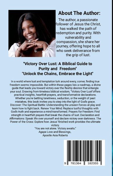 Dear Reader, Welcome to "Victory Over Lust: A Biblical Guide to Purity and Freedom." This book is a heartfelt journey into the depths of one of the most challenging battles we face as believers the battle against lust and sexual immorality. Whether you are struggling with these issues yourself or seeking to support someone who is, this book is designed to provide you with biblical wisdom, practical insights, and spiritual encouragement. In these pages, you will find: ¿ Understanding and Insight: Learn about the nature of lust and sexual immorality, and how they can entangle our hearts and minds. ¿ Spiritual Warfare: Discover the reality of the spiritual battle we face and how to equip yourself with the full armor of God. ¿ Practical Steps to Freedom: Gain practical tools and strategies to break free from the chains of lust and live a life of purity. ¿ Declarations and Affirmations: Speak God's truth over your life and reinforce your commitment to purity with powerful declarations and affirmations. ¿ Prayers and Renunciations: Engage in heartfelt prayers and renunciations to resist the enemy and embrace the freedom that Christ offers. This book is not just a guide; it is a companion on your journey toward purity and freedom. It is my prayer that as you read, you will experience the transformative power of God's love and grace. Remember, you are not alone in this battle. The Holy Spirit is with you, guiding and empowering you every step of the way. May this book be a source of hope, encouragement, and empowerment. May it draw you closer to the heart of the Father and deepen your relationship with Jesus. Together, let us walk the path of purity and experience the abundant life that God has promised. With love and blessings, Apostle Asia Roberts