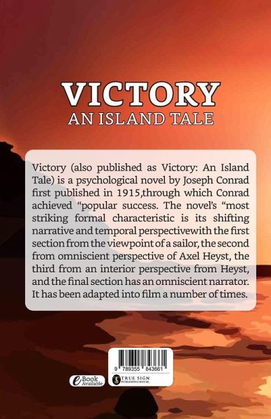 Victory (also published as Victory: An Island Tale) is a psychological novel by Joseph Conrad first published in 1915,through which Conrad achieved ""popular success The novel's ""most striking formal characteristic is its shifting narrative and temporal perspectivewith the first section from the viewpoint of a sailor, the second from omniscient perspective of Axel Heyst, the third from an interior perspective from Heyst, and the final section has an omniscient narrator.It has been adapted into film a number of times.