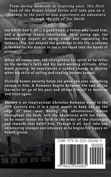 Joe Smith not only had a good home and a father who loved him, but also a wealthy future inheritance. At a young age, Joe becomes an expert at doing trade and captaining his father's ship, but despite the goodness in his life, a scheme is formed for his demise as he is betrayed into the hands of pirates. When all seems lost, Joe strengthens himself as he relies on his mother's faith and his hard-working attitude. After much determination, he experiences a sudden change in destiny when his skills in sailing and trading become known. Victoria Kemet secretly helps Joe when she sees something unique in him. Soon, a romance begins between the two as Joe learns to let go of his past and allows his heart to trust again. Victory is an Inspirational Historical Christian Romance novel meant to keep you on the edge of your seat. Join the adventures with Joe Smith, as he never leaves his faith in the midst of the challenges and rewards that befall him. Through it all, he'll take you on amazing voyages and odysseys as he begins his legacy on Kemet Island.